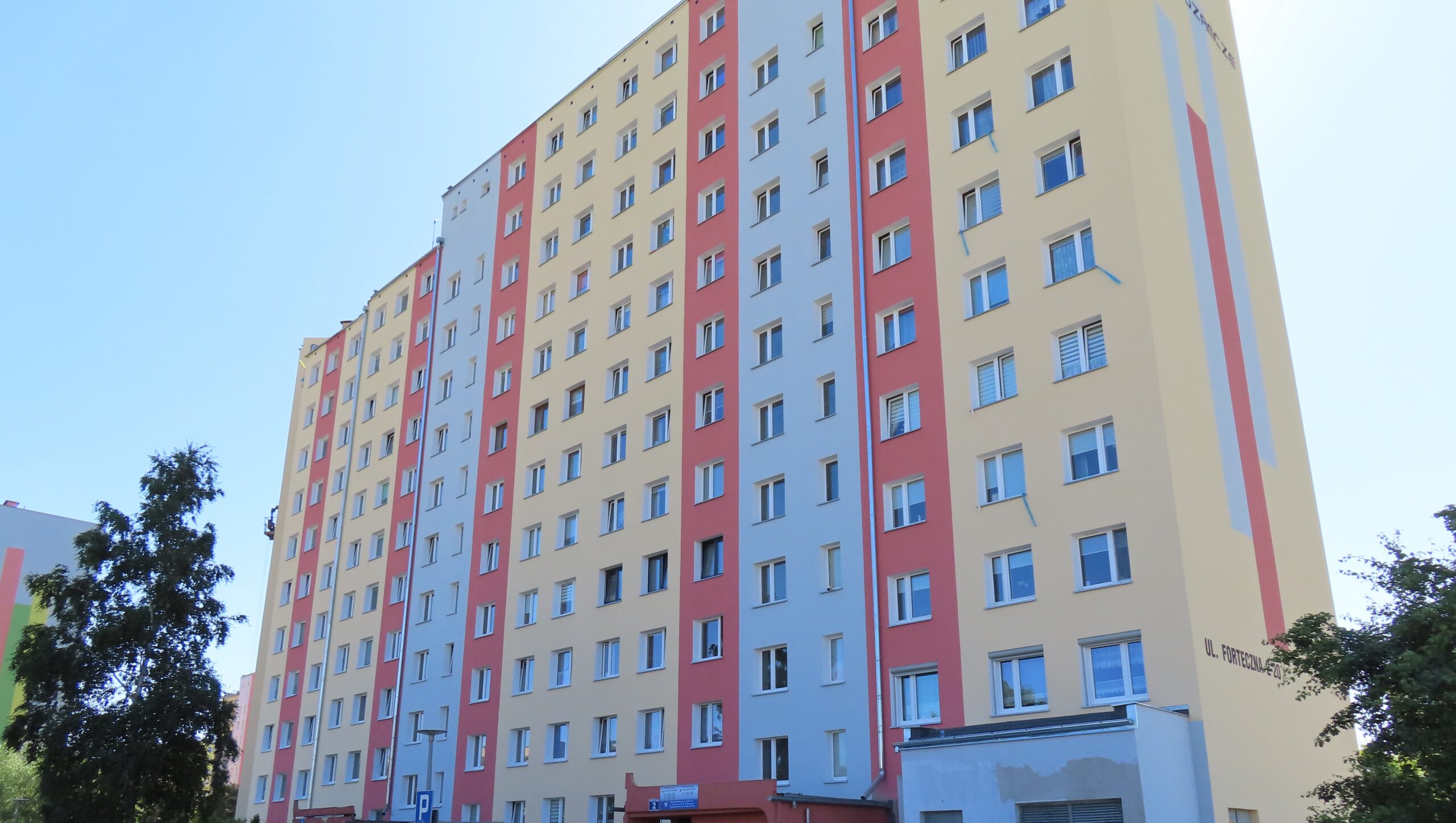 Kompleksowa termomodernizacja budynku mieszkalnego, 10 klatek, 319 lokali mieszkalnych, powierzchnia 19590m2 : obejmuje swoim zakresem docieplenie stropodachu wentylowanego, stropodachu niewentylowanego, ścian zewnętrznych budynku w tym ścian balonowych, ścian cokołu, ścian nadbudówek, wymianę stolarki drzwiowej wejściowej, okien w maszynowni dźwigów. Wymiana leżaków instalacji c.o. z izolacją w poziomie piwnic wraz z zaworami regulacji podpionowej, remont dwóch węzłów c.o. i c.w.u. wraz z urządzeniami regulującymi dostawy ciepła, automatyka pogodowa, moduły regulacji ECL, oprogramowanie AI (system SWC) . Zmniejszenie rocznego zapotrzebowania na energię 57%.