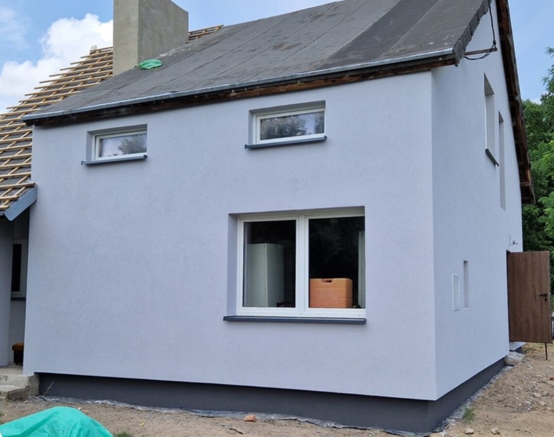 Wymieniono starego, nieefektywnego kopciucha na pompę ciepła powietrze/woda o mocy 10kW, o podwyższonej klasie efektywności energetycznej (A++). Wykonano również nową instalację c.o. w której skład wchodzi nowe orurowanie oraz piony całego budynku, trzy grzejniki niskotemperaturowe, 3-płytowe i głowice termostatyczne. W ramach nowej instalacji c.w.u., po uprzednim badaniu złoża, wykonano stację uzdatniania wody co znacznie poprawiło jakość wody czerpanej ze studni głębinowej, a także nowe piony z przyłączem do łazienki. Ocieplenie ścian zewnętrznych zostało wykonane styropianem o grubości 15cm i współczynniku lambda=0,031. W miejsce starych okien drewnianych skrzynkowych zamontowano okna PVC 3-szybowe, a 2 pary drzwi drewnianych wymieniono na drzwi stalowe w pięknym, nowoczesnym kolorze Toffee z eleganckimi pochwytami. We własnym zakresie inwestor ocieplił dach wełną mineralną i wymienił pokrycie dachowe, na którym generalny wykonawca termomodernizacji wykonał instalację fotowoltaiczną o mocy 3,84 kWp.